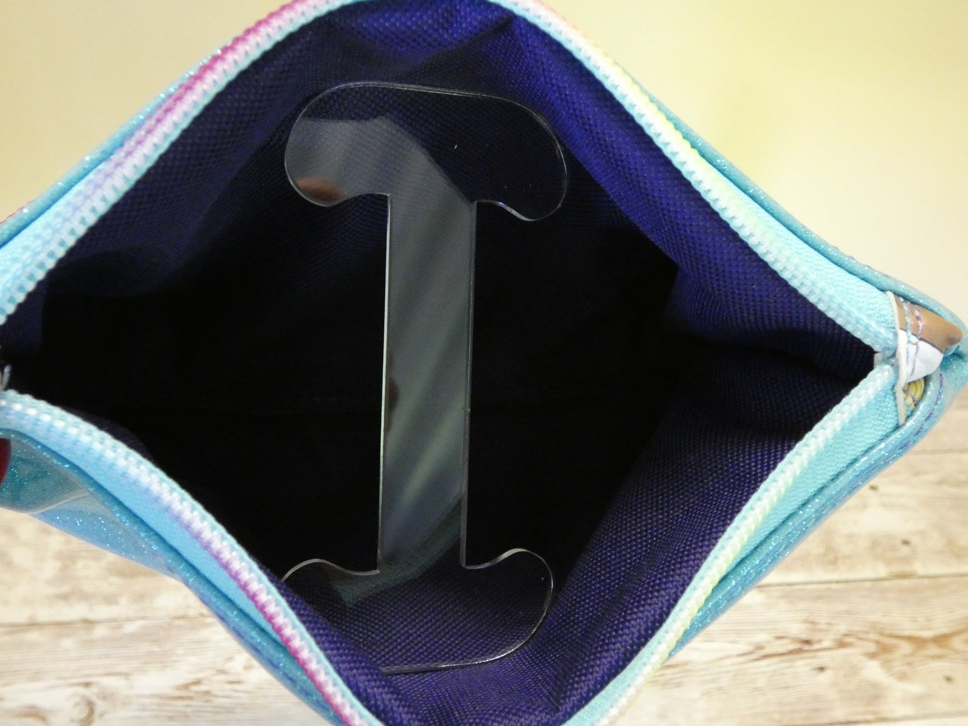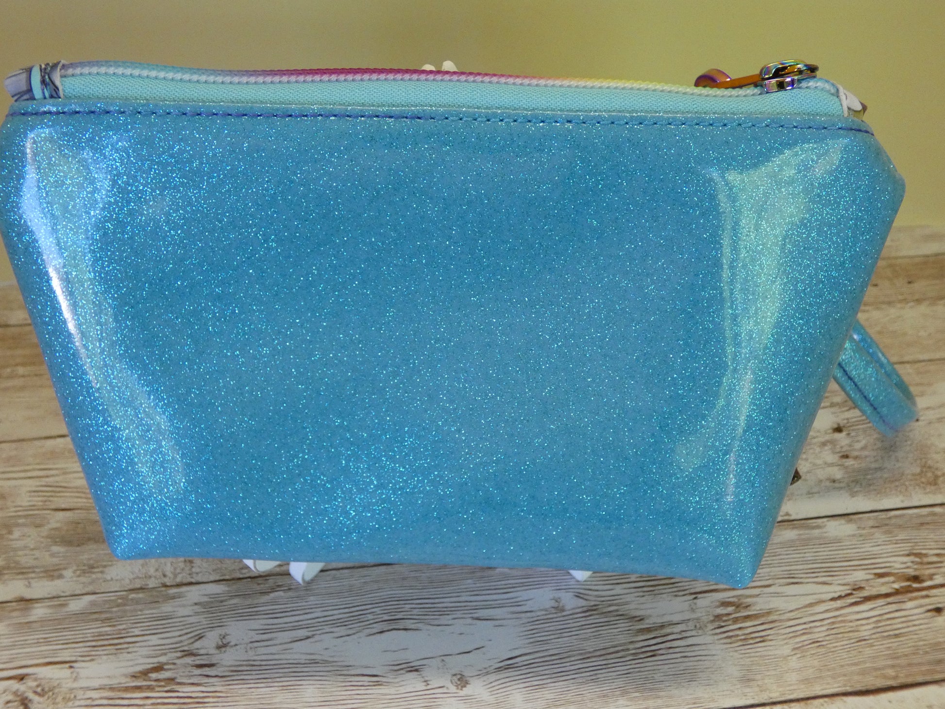 This wristlet will hold your essentials. The exterior is a vinyl print depicting TS different records with sky blue glitter vinyl. The interior is purple waterproof canvas. This wristlet has two zipper closures with a convenient detachable wrist strap. I handcrafted this item using high quality materials and an industrial sewing machine. This bag was handcrafted using the pattern “Devon Pouch” by SOTAK Patterns. Full credit to the pattern designer for this design.